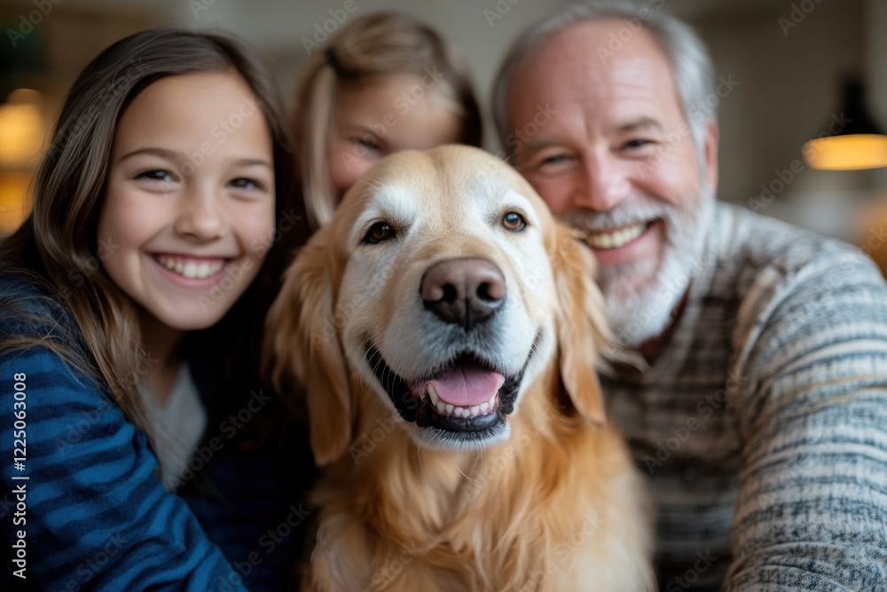 Fototapeta na wymiar - A joyful family poses closely with their golden retriever dog, showcasing love and bonding in a warm home atmosphere filled with happiness and togetherness..