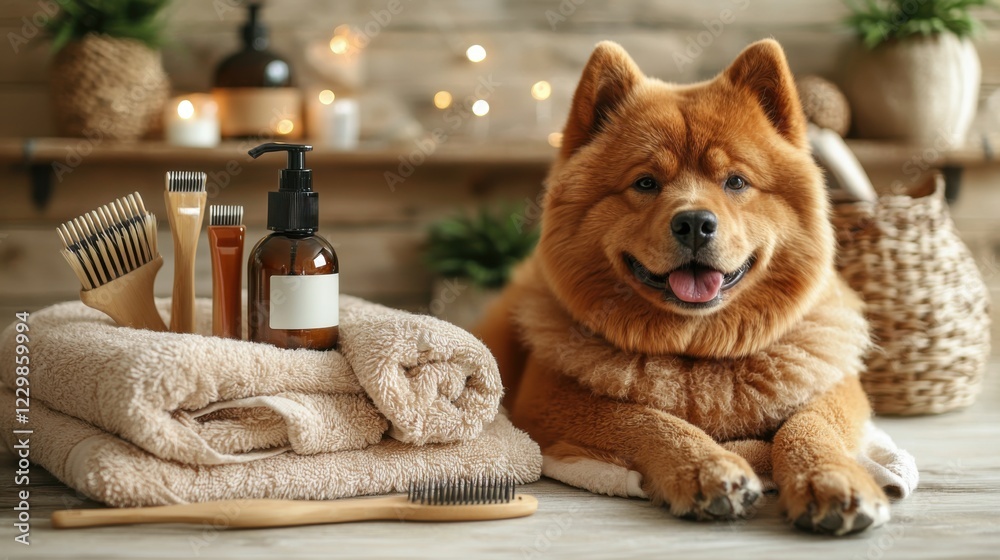 Fototapeta na wymiar - Sustainable Pet Care concept Charming dog with grooming products in a cozy setting..