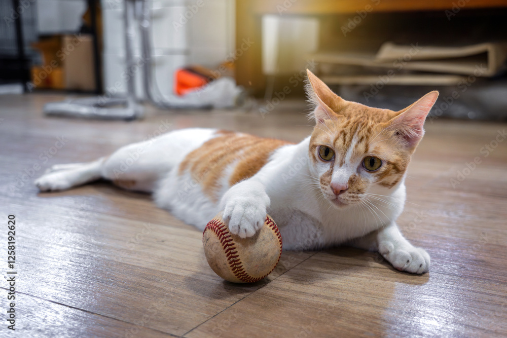 Fototapeta na wymiar - Cats are lie down playing. Orange and white tabby cat with an old baseball toy on the floor in home with a warm atmosphere..