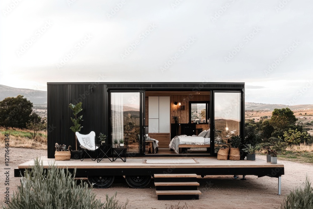 Fototapeta na wymiar - Exploring scandinavian tiny home on wheels nature-inspired design mobile living open air minimalist concept.