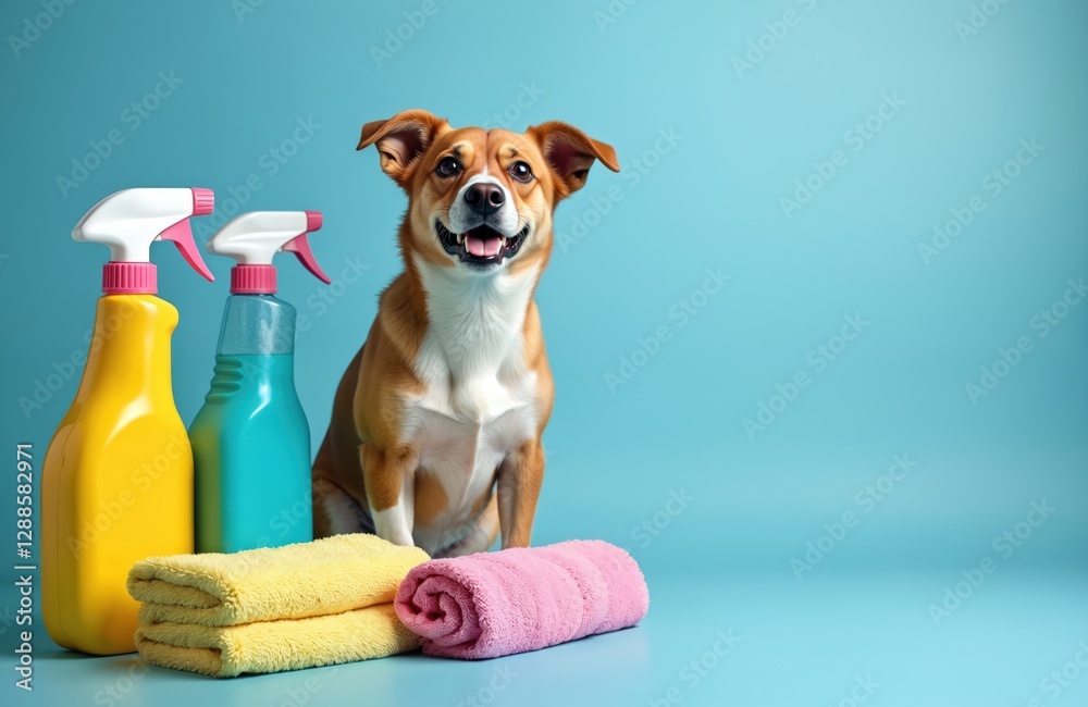 >Fototapety na wymiar>Wybrane motywy - zobacz więcej !>Zwierzęta>Happy dog sitting near cleaning spray bottles, towels. Pet care spring cleaning concept, household chores. Cute animal posing in studio on blue background. Design for banner with copy space.