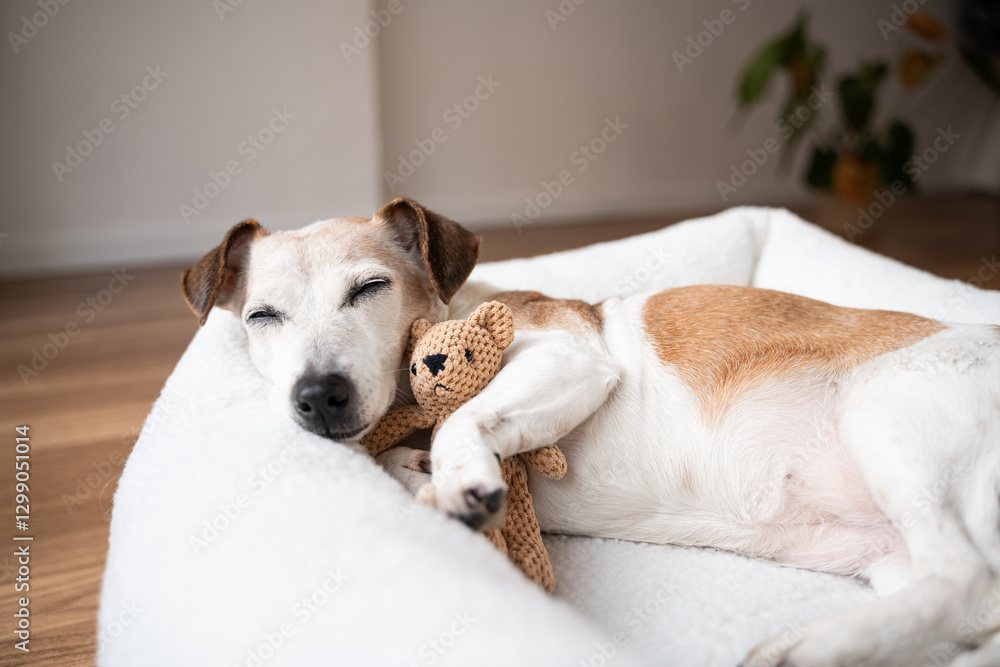 Fototapeta na wymiar - Sleepy dog face resting in bed. Senior pet Jack Russell terrier hugging small toy in bed. Cute relaxed atmosphere. Relaxing at home with family.