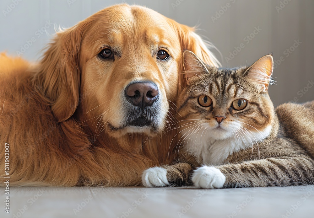 Fototapeta na wymiar - Golden Retriever and Tabby Cat Snuggled Together in a Bright Cozy Room Displaying Friendship : Generative AI.