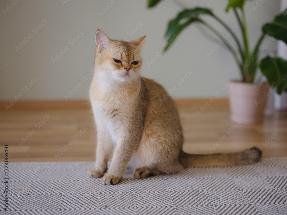 Fototapeta na wymiar - Beautiful short hair cat and house plant at home . Adorable domestic pet concept. Pet resting and hides in greenery.