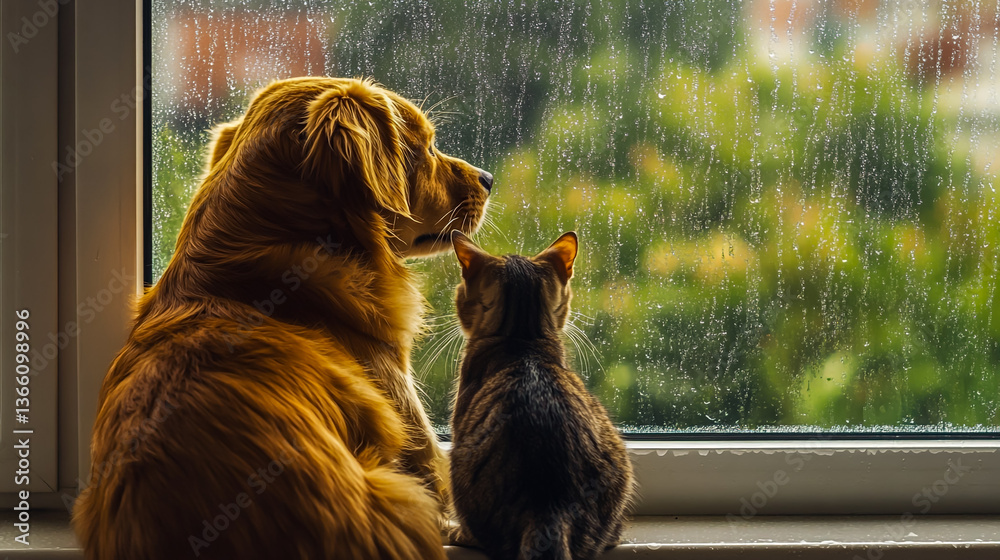 Fototapeta na wymiar - Golden retriever dog and tabby cat watching rain outside window animal friendship cute pets rainy weather.