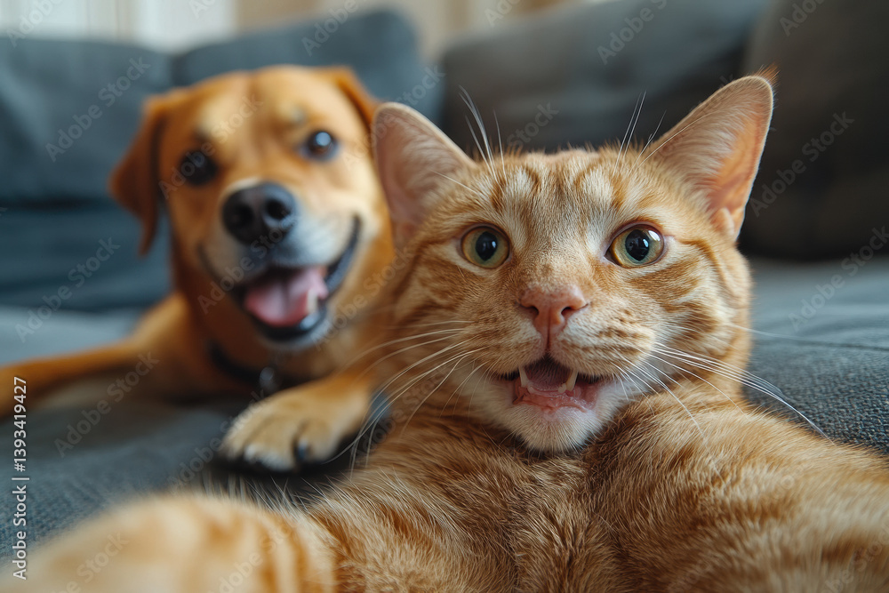 Fototapeta na wymiar - Playful cat taking selfie with dog - humorous pet moments captured in cozy home setting.