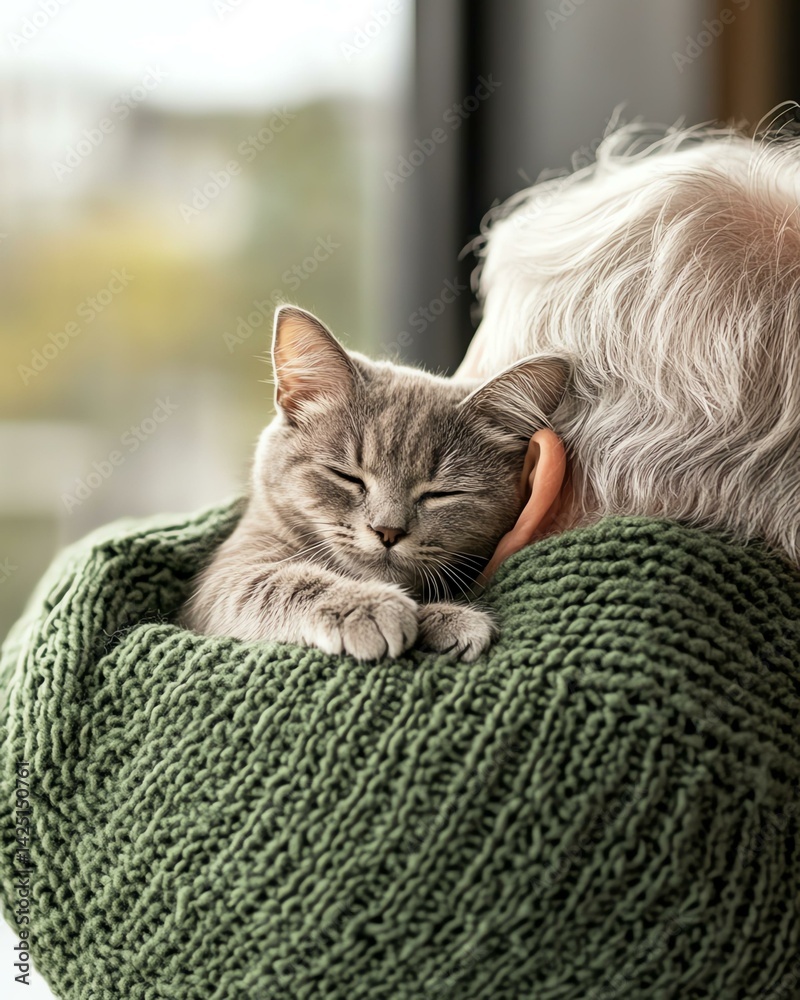 Fototapeta na wymiar - Joyful adopting pets in retirement to enhance well-being, heartwarming adopting pets in retirement for emotional connection. Cozy embrace with a cat and an elderly person..