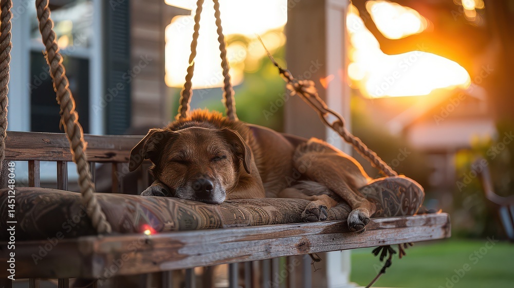 Fototapeta na wymiar - A dog is sleeping on a porch swing with ropes and a cushion during a golden sunset in the background.
