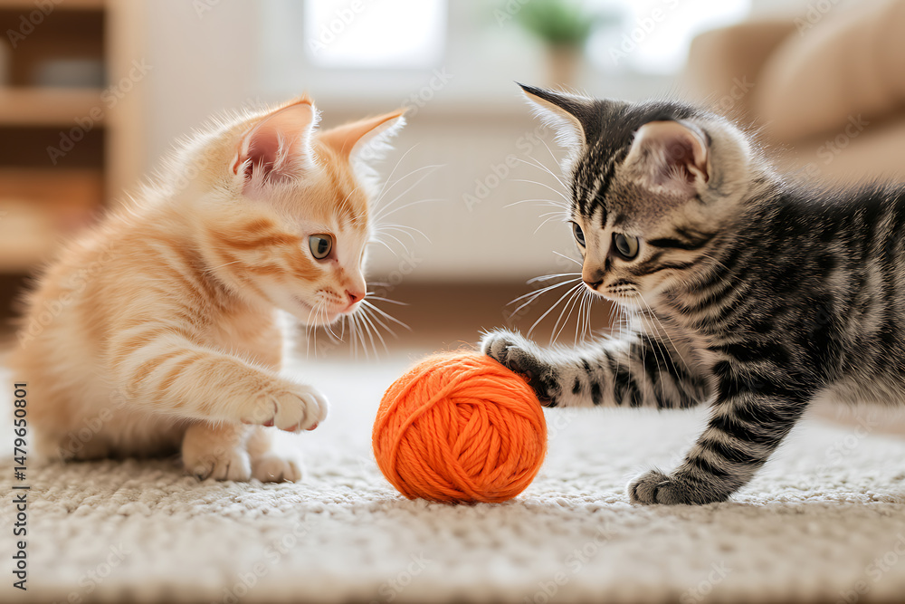 Fototapeta na wymiar - Two kittens play with a ball of yarn on a carpet. The kittens have different coat colors. It is a cute domestic scene filled with curiosity..