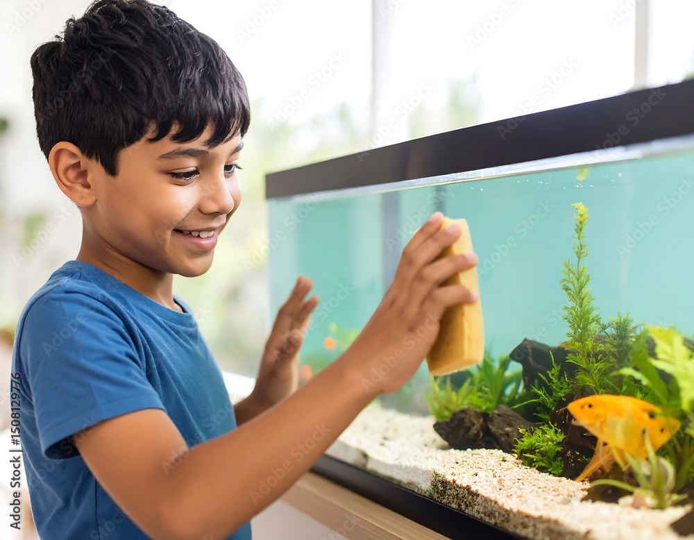 Fototapeta na wymiar - Smiling boy cleaning a home aquarium.