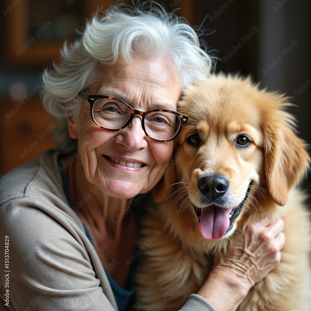 >Fototapety na wymiar>Wybrane motywy - zobacz więcej !>Zwierzęta>Smiling senior woman hugs Golden Retriever dog. Elderly lady in glasses enjoys pet companionship, shows true friendship, joy. Pets help seniors overcome loneliness. Dog is best friend.