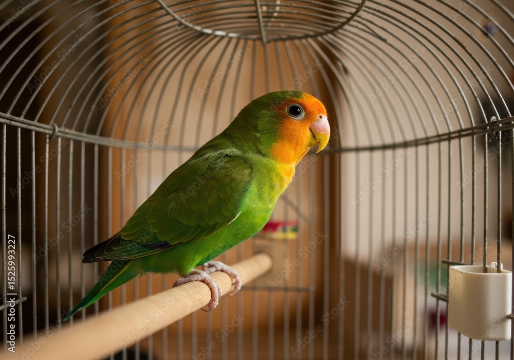 Fototapeta na wymiar - Colorful parrot perched on wooden perch inside metal cage with blurred background of home environment showcasing bird’s vibrant plumage and expressive features.