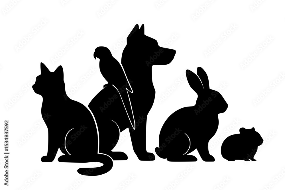 Fototapeta na wymiar - Various pets in silhouette including cat, dog, rabbit, and bird .
