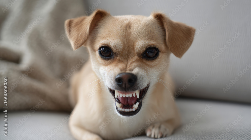 Fototapeta na wymiar - Close-up of an angry puppy showing tiny teeth with a fierce expression in a cozy indoor setting with a couch and blanket.