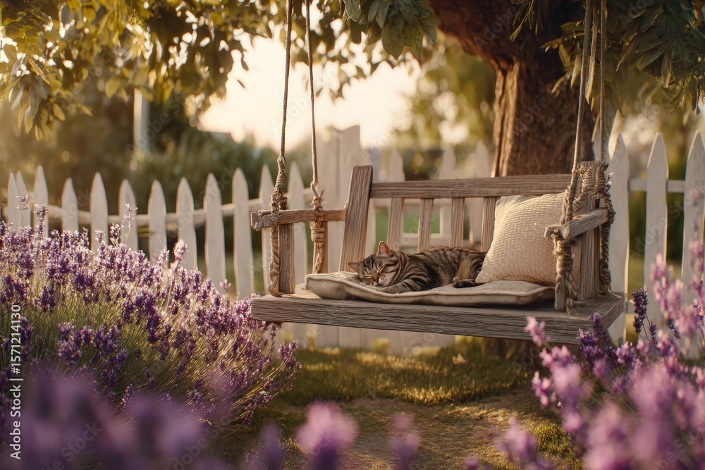 Fototapeta na wymiar - Cat relaxing on a swing in a lavender garden during golden hour.