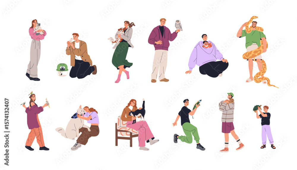 Fototapeta na wymiar - People and different pets set. Happy home animal owners holding and caring for dog, cat, parrot, boa snake, turtle, exotic iguana, hamster, owl. Flat vector illustration isolated on white background.