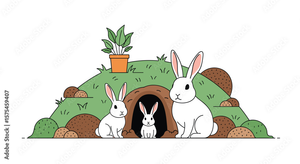Fototapeta na wymiar - A family of fluffy white rabbits emerging from their cozy burrow nestled amongst green hills.