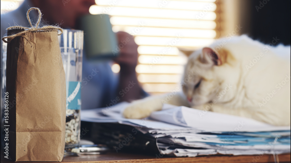 >Fototapety na wymiar>Wybrane motywy - zobacz więcej !>Zwierzęta>Cozy workspace featuring business owner enjoying drink while fluffy white cat rests on pile of papers. scene captures blend of productivity and relaxation, highlighting comfort of home