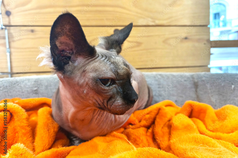 Fototapeta na wymiar - Sphynx cat resting on soft orange blanket in cozy wooden interior. Cat with wrinkled skin and expressive face, pet.