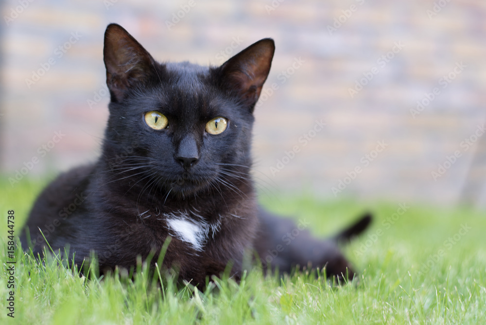 Fototapeta na wymiar - Domestic black cat laying on the grass.