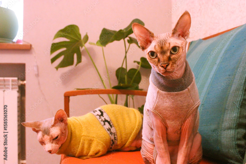 >Fototapety na wymiar>Wybrane motywy - zobacz więcej !>Zwierzęta>Two Sphynx cats in a comfortable indoor setting, one wearing a yellow sweater, the other in gray. Canadian Sphinx felines in a cozy home interior setting with monstera plant with green leaves.