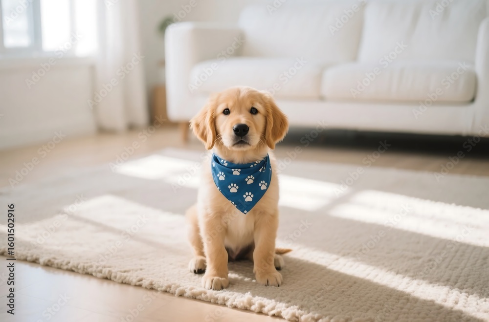 Fototapeta na wymiar - Golden retriever puppy with blue bandana, beige rug and bright living room, pet photography for home lifestyle branding.