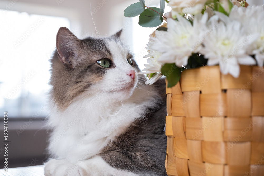 Fototapeta na wymiar - A cute gray cat is sitting on a table at home with a bouquet of flowers. The pets are eating the flowers..