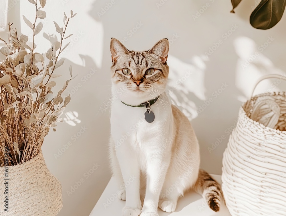 Fototapeta na wymiar - A domestic cat with striking green eyes sits calmly amidst natural home decor, bathed in warm sunlight, creating a serene and inviting atmosphere.