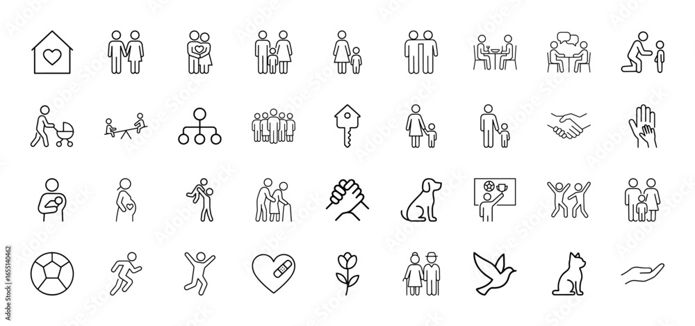 Fototapeta na wymiar - Family and social line icon set. Vector pictograms of couples, children, groups, homes, pets, hearts, handshakes, elderly, activities, thin linear illustration..