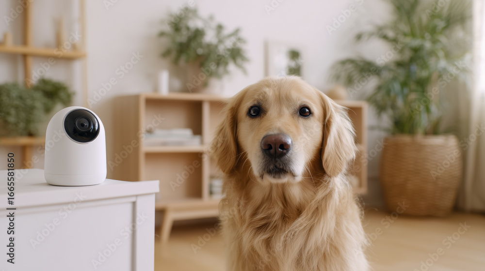 Fototapeta na wymiar - Golden retriever dog at home with smart pet monitoring camera.