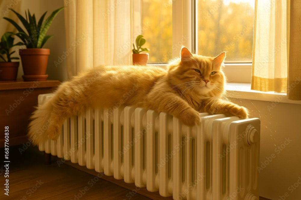 Fototapeta na wymiar - advertising image on the topic of a cat lounging on a radiator for posts and banners on the topic of autumn melancholy, home comfort, pets and their habits.