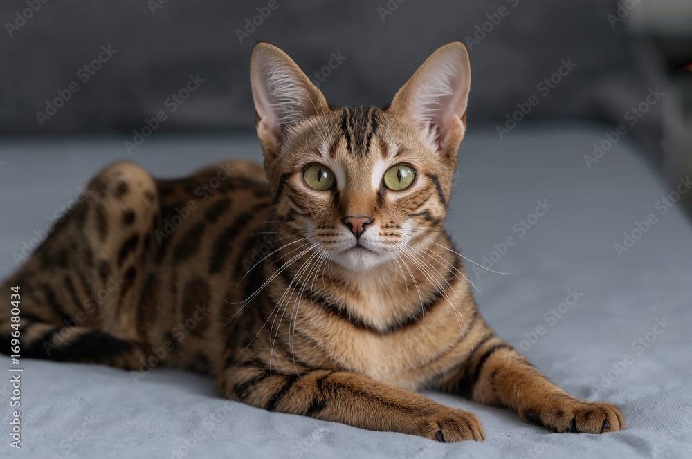 Fototapeta na wymiar - Attractive short-furred young feline relaxing on bed indoors, Bengal breed gazing at lens. Pets in home environment..