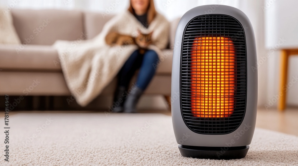 Fototapeta na wymiar - Cozy ambiance created by a modern electric heater warming a living room with a blanket-clad woman and her cat.