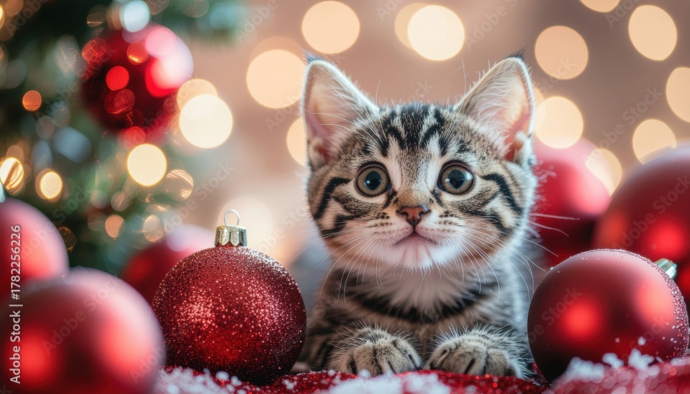Fototapeta na wymiar - Festive cat playful scene cozy home cute animal photography christmas environment close-up holiday cheer.