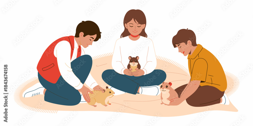 Fototapeta na wymiar - Three children are joyfully interacting with adorable hamsters, showcasing friendship, playfulness, and the joy of pets in a warm and inviting home setting..
