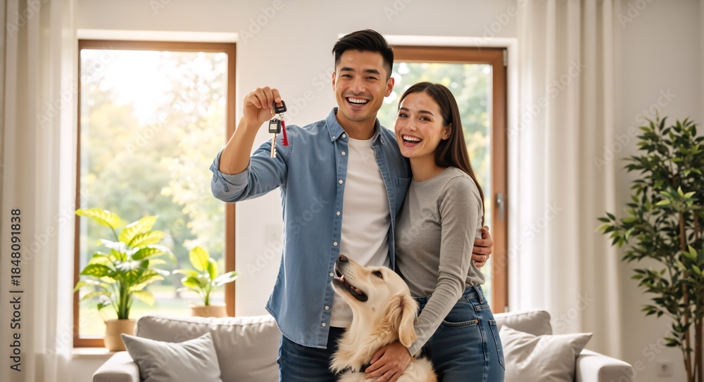 Fototapeta na wymiar - Happy young couple with their dog holding keys in their new home. Joyful homeowners celebrating buying a house. Real estate and property ownership concept.