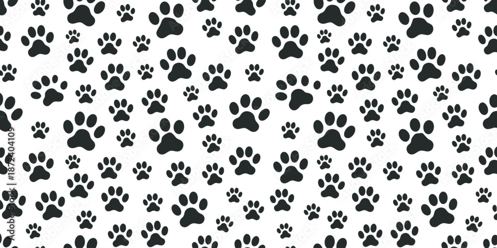 Fototapeta na wymiar - A captivating seamless pattern of black paw prints on a white background, symbolizing the playful spirit and heartfelt bond with pets.