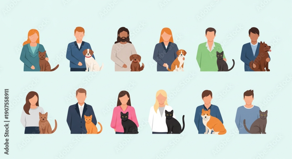 Fototapeta na wymiar - Diverse group of people with their pets cats and dogs..