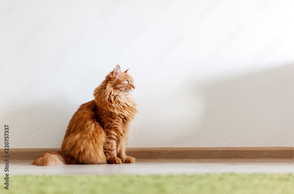 Fototapeta na wymiar - Portrait of a funny beautiful red fluffy cat with green eyes in the interior, pets.