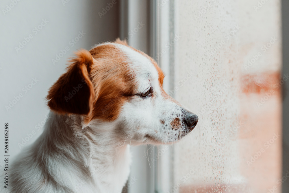 Fototapeta na wymiar - cute small dog sitting by the window. Rainy day, water drops on the window glass. Dog looking bored or sad. Pets at home indoors.
