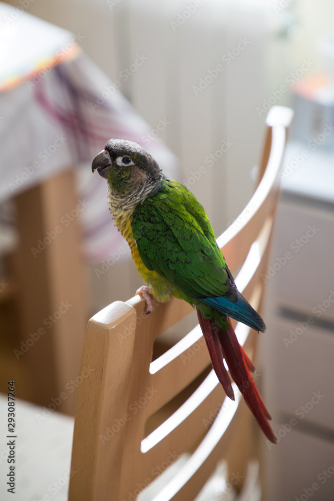 Fototapeta na wymiar - Domestic parrot bird standing on a home chair from above.