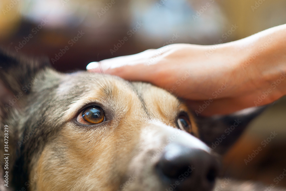 Fototapeta na wymiar - Dog at home stroking hand, pet. Favorite pet close-up, selective focus.