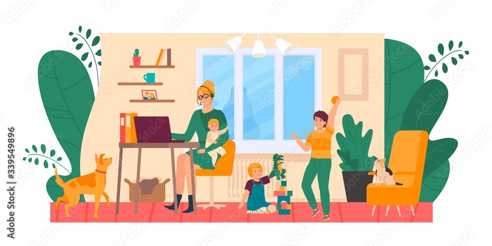 >Fototapety na wymiar>Wybrane motywy - zobacz więcej !>Zwierzęta>Mother freelance at home, stressed with kids vector illustration. Tired and annoyed woman at computer, children and pets make mess at room, workplace. Remote business worker character.
