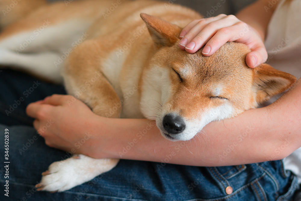 Fototapeta na wymiar - A woman petting a cute red dog Shiba inu, sleeping on her lap. Close-up. Happy cozy moments of life. Stay at home concept.