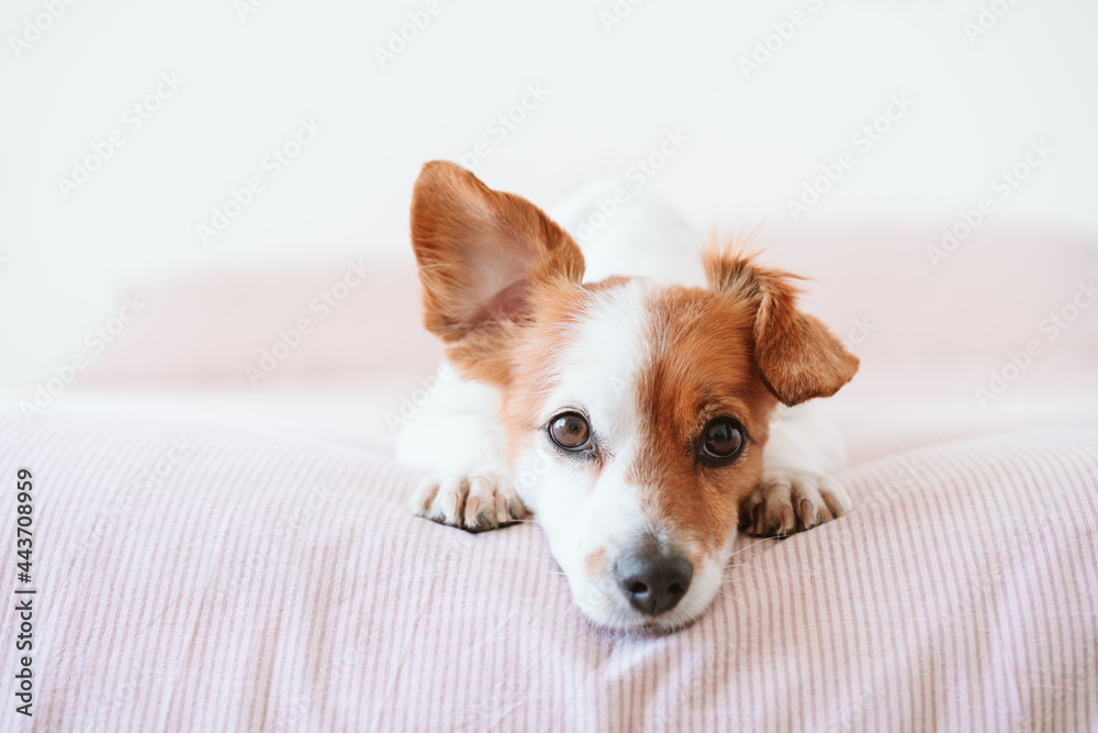 Fototapeta na wymiar - close up of cute lovely small jack russell dog resting on bed during daytime. Funny ear up. Pets indoors at home.