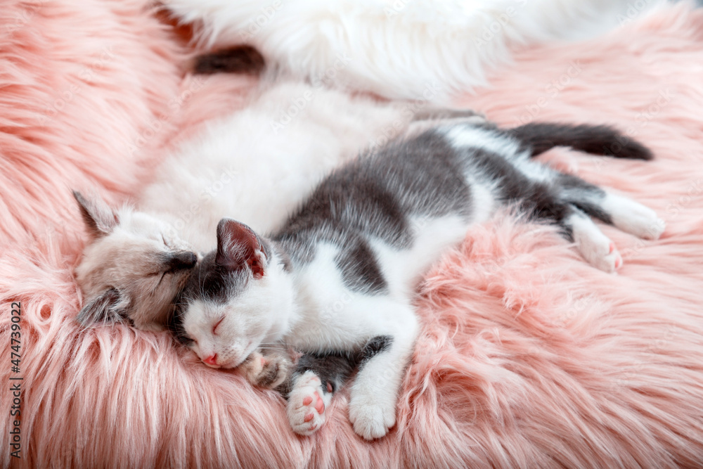 Fototapeta na wymiar - Couple little happy Cute kittens in love sleep nap together on pink fluffy plaid. 2 two cats pets animal comfortably sleep relax have sweet dreams at cozy home. Kittens on bed.