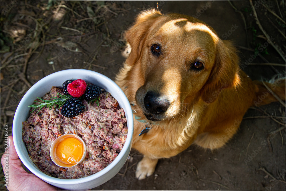 Fototapeta na wymiar - Golden retriever wating for her bowl of fresh meat, bones, and veggies, raw food bowl.