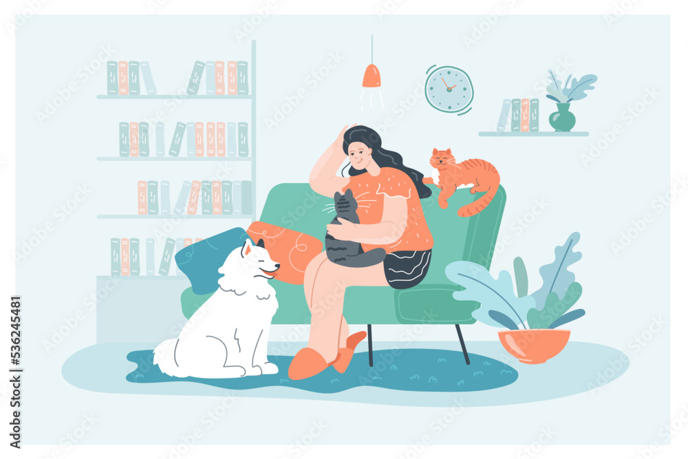 Fototapeta na wymiar - Female cartoon owner sitting on couch with cats and dog at home. Adorable scene in cozy living room with happy woman relaxing on sofa with domestic animals flat vector illustration. Pets, love concept.