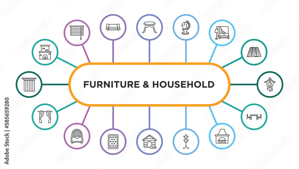 >Fototapety na wymiar>Wybrane motywy - zobacz więcej !>Zwierzęta>furniture & household outline icons with infographic template. thin line icons such as fireplace, side table, globe, living room, cuckoo clock, curtains, dehumidifier, mattress, pet house, coat