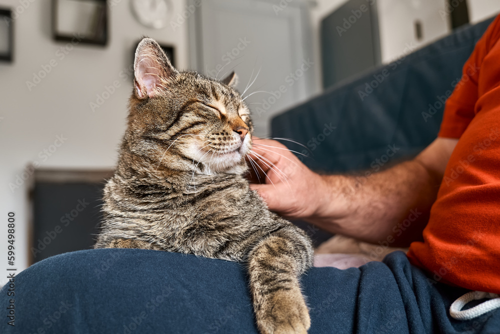 Fototapeta na wymiar - Man hugging cute tabby cat in indoor scene. Human-animal relationships. Funny home pet. Homeless pets. Pets care. Funny home pet. Cat day. Adopted pet..